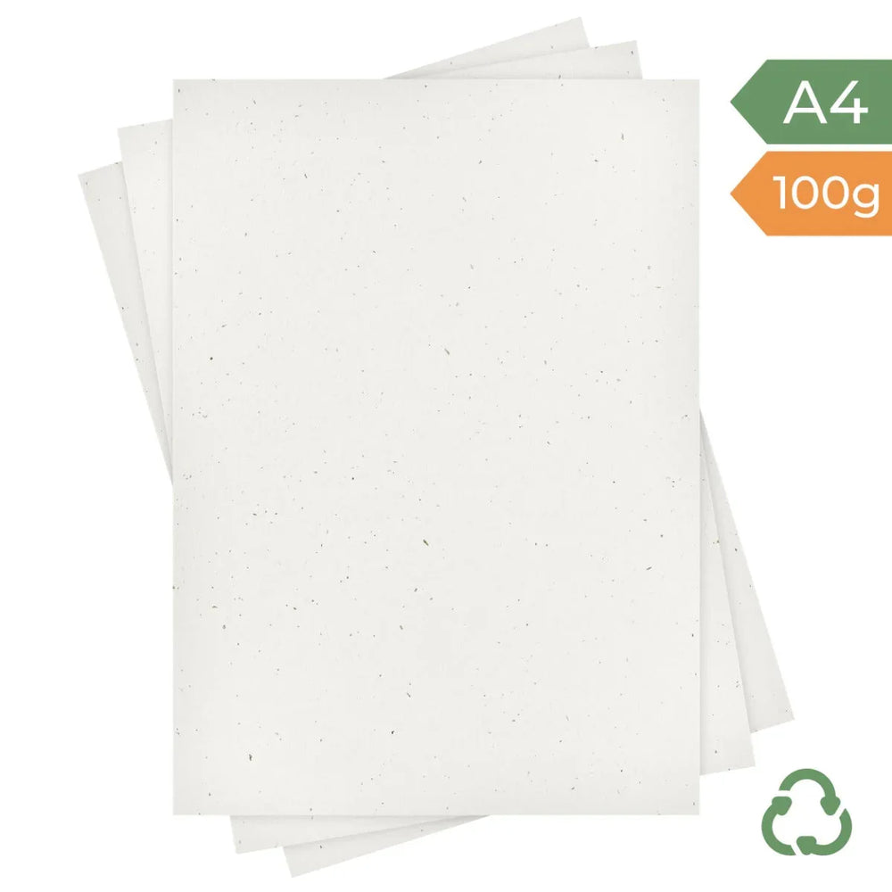 A4 size recycled paper in premium shade 'Oat Fleck', an off-white premium board with visible flecks and fibres, made from 40% Recycled PCW, 5% cotton and 55% FSC virgin fibre.